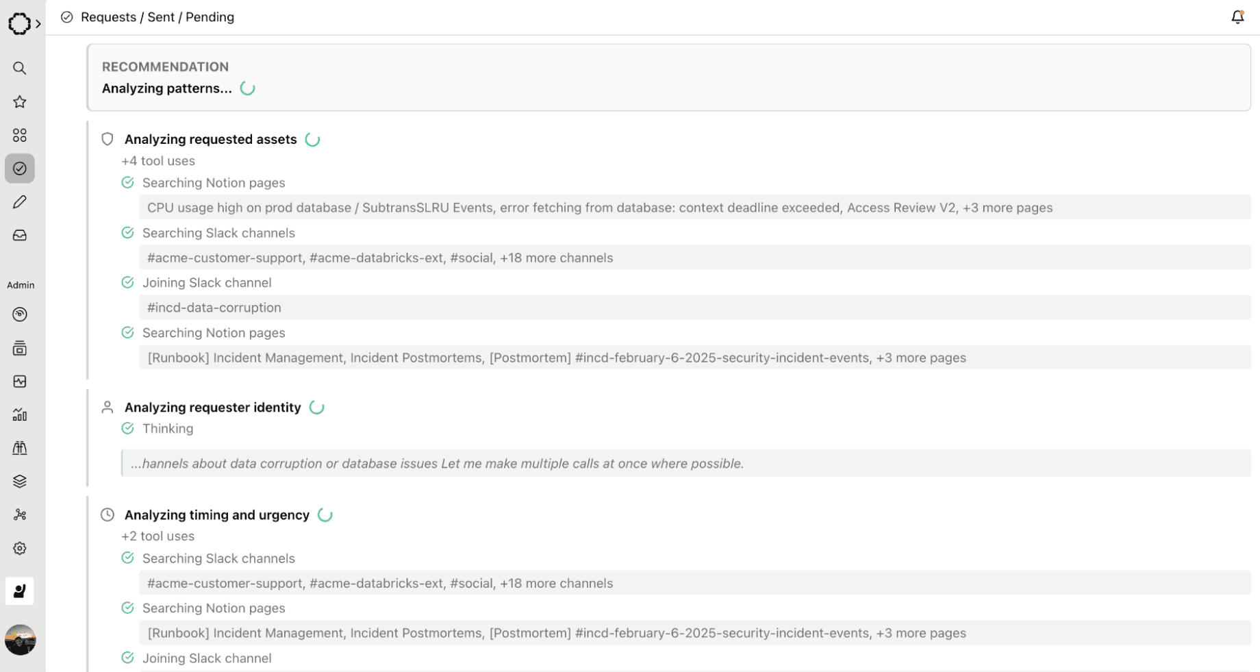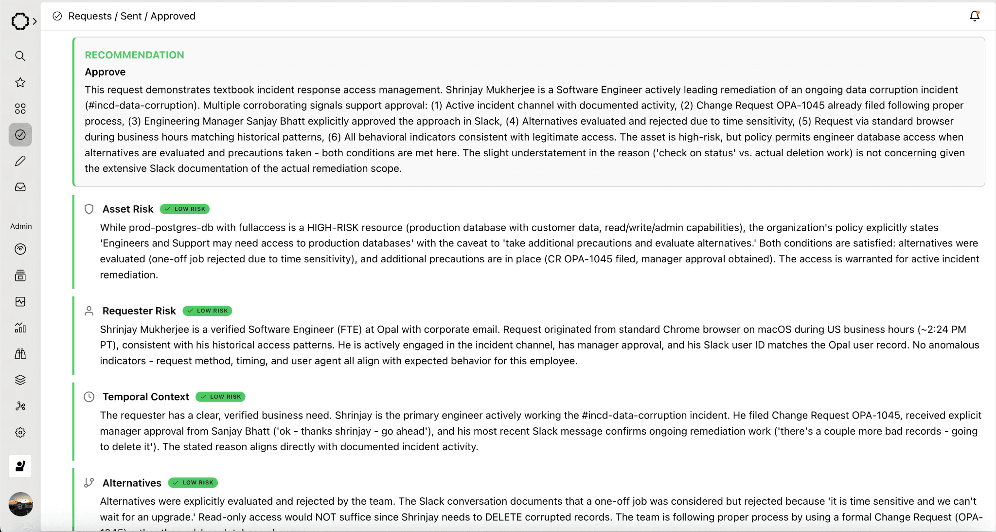 Finding those answers means toggling between Okta, PagerDuty, Opal's access logs, a data classification spreadsheet, and whatever Slack channel the on-call team uses. The cost of doing that investigation for every request is prohibitive. So reviewers take shortcuts. They approve based on gut feel, they rubber-stamp because the requester is a familiar name, or they slow-walk everything into a multi-day queue because they can't distinguish the urgent from the routine.